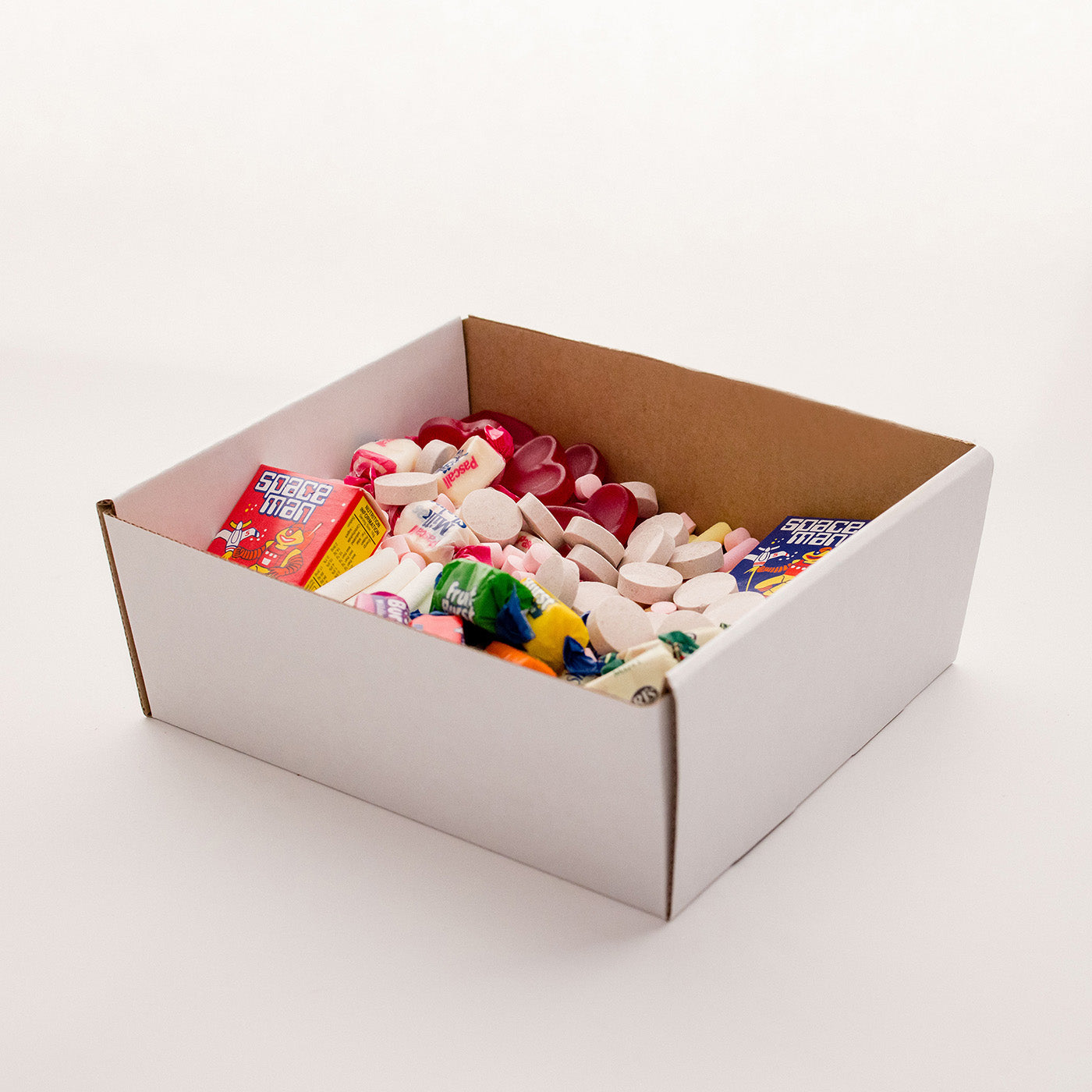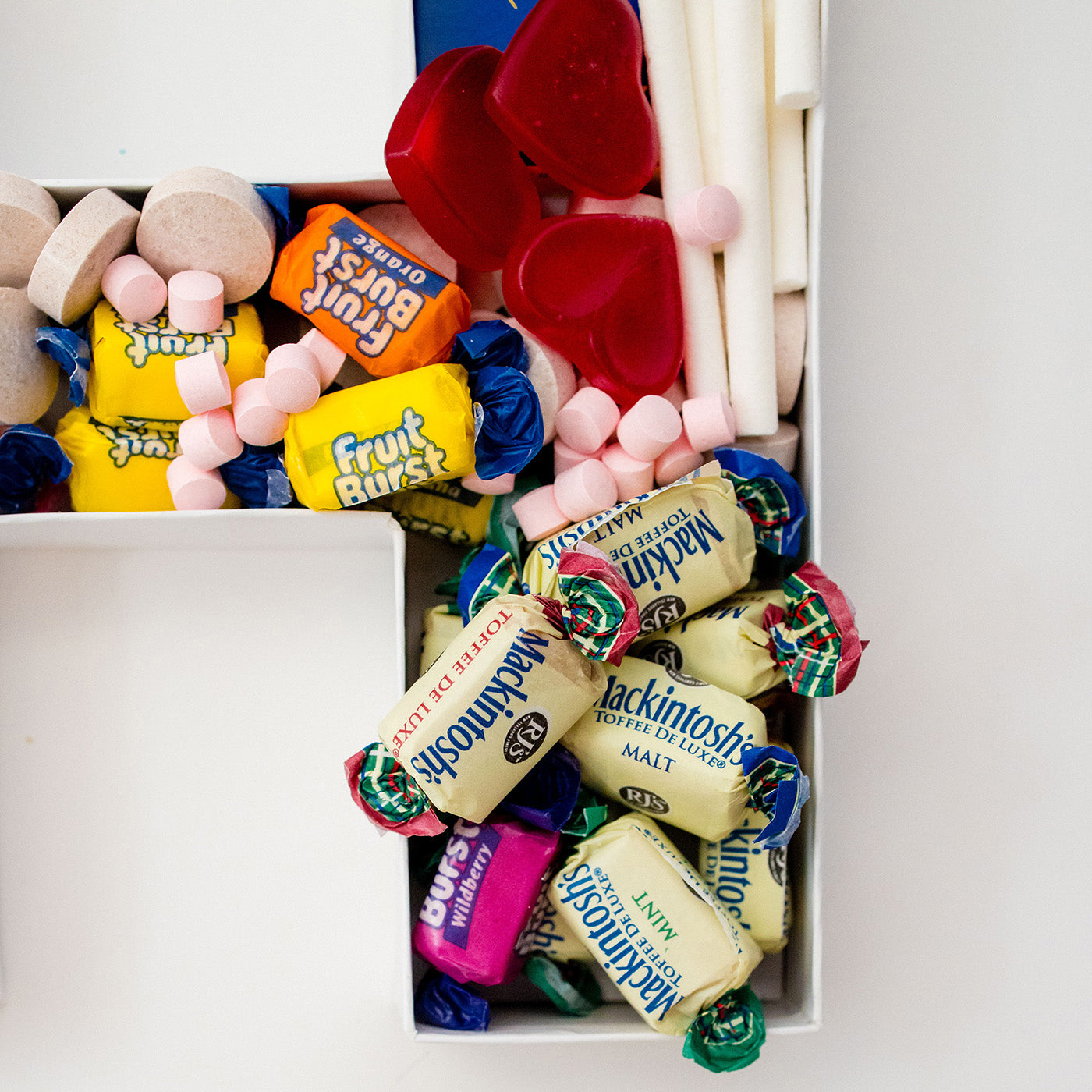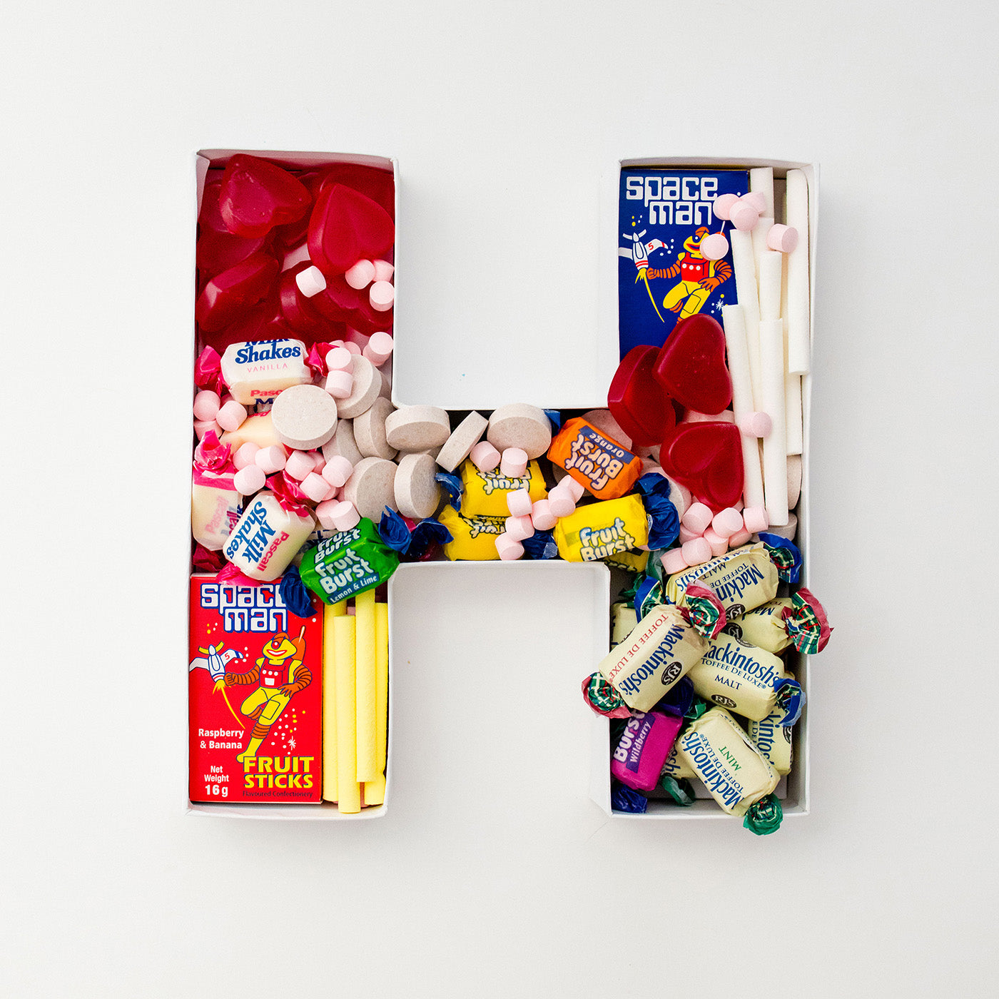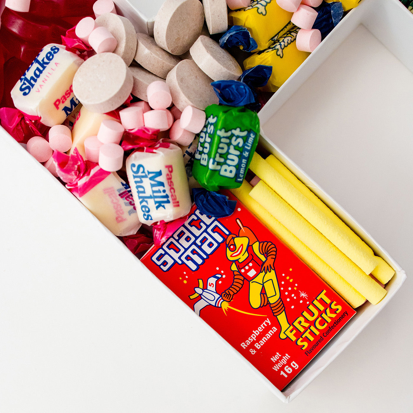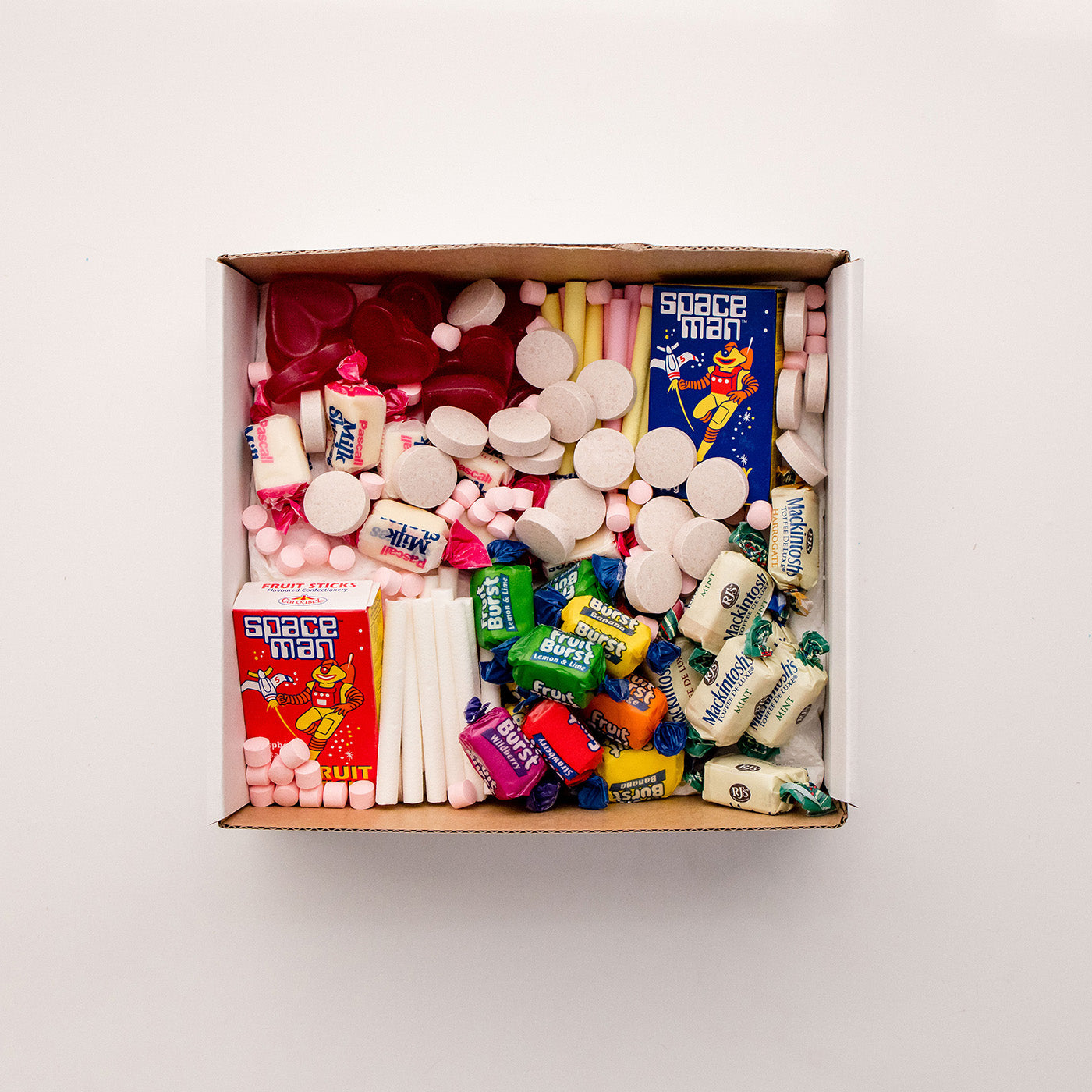 A proper throwback packed with Space Man fruit sticks, Fruit Bursts, Mackintosh’s mints, Pascall Milk Chews, chalk sticks, candy tablets and classic chewy favourites — just like the corner days.